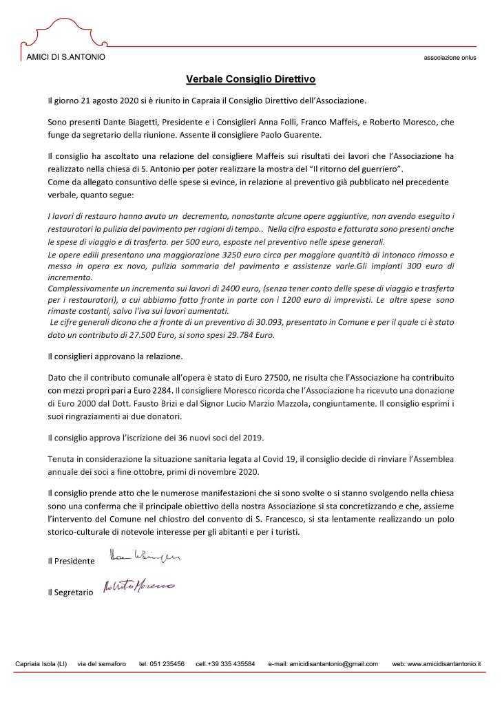 Verbale del Consiglio Direttivo del 21 agosto 2020