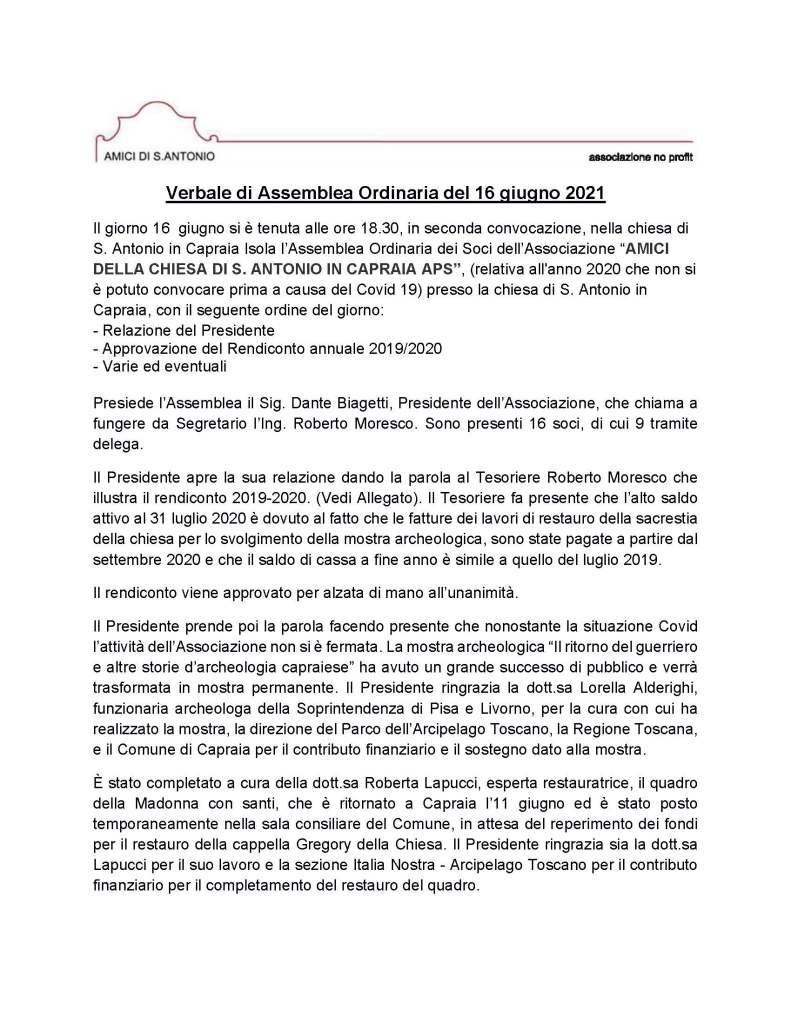 Il giorno 21 agosto 2024 si è tenuta alle ore 18.30, in seconda convocazione, nella chiesa di S.Antonio in Capraia Isola, l’Assemblea Ordinaria dei Soci dell’Associazione “AMICI DELLA CHIESA DI S. ANTONIO IN CAPRAIA APS”, con il seguente ordine del giorno:
