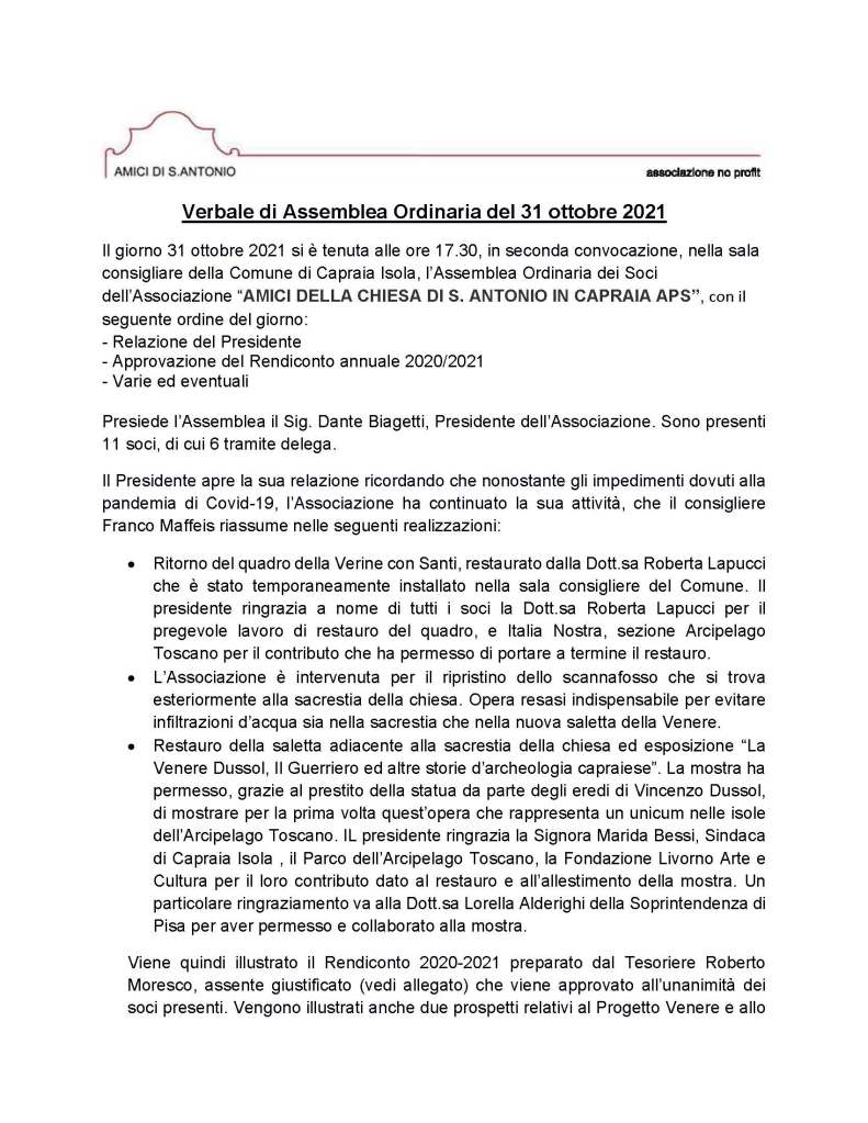 Il giorno 30 ottobre 2022 si è tenuta alle ore 17.00, in seconda convocazione, nella sala consigliare della Comune di Capraia Isola, l’Assemblea Ordinaria dei Soci dell’Associazione “AMICI DELLA CHIESA DI S. ANTONIO IN CAPRAIA APS”, con il seguente ordine del giorno:
