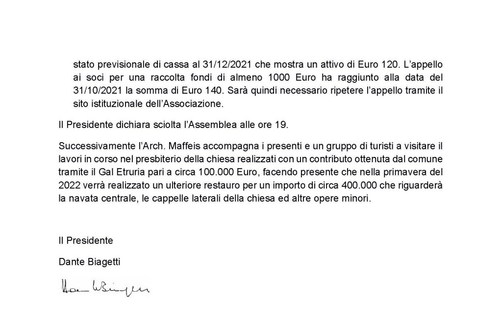 - Il Consiglio Direttivo in scadenza viene prorogato fino a chiudere il progetto Cantiere Scuola Restauro e ad ottenere dal Comune il rimborso completo delle spese sostenute, che si prevede possano essere recuperate entro il 31/3/2026,