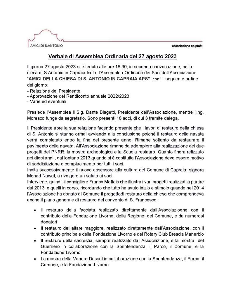 Il giorno 22 agosto 2024 si è tenuta alle ore 18.30, in seconda convocazione, nella chiesa di S.Antonio in Capraia Isola, l’Assemblea Ordinaria dei Soci dell’Associazione “AMICI DELLA CHIESA DI S. ANTONIO IN CAPRAIA APS”, con il seguente ordine del giorno: