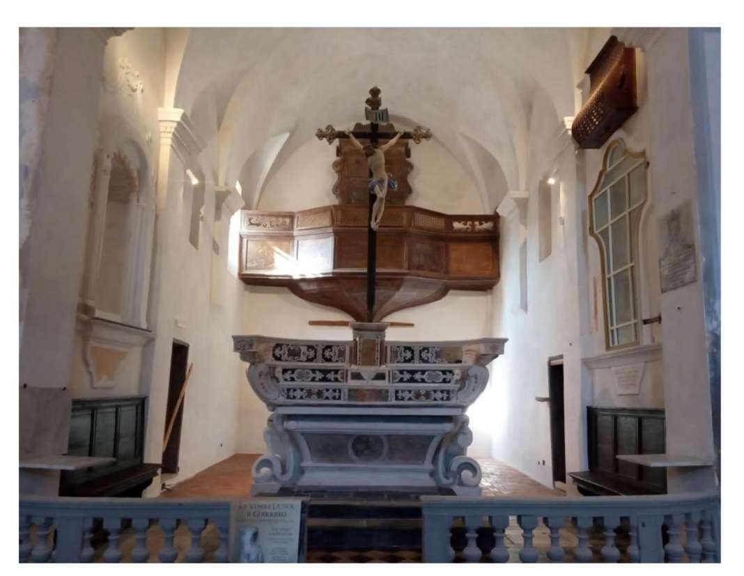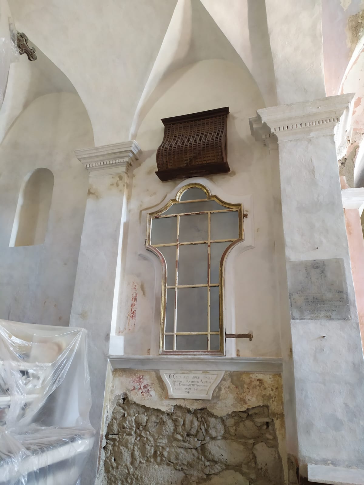 Gli operai inviati a Capraia dalla Scuola per il montaggio dell’impalcatura per il restauro dell’armadio dell’organo hanno riposto sugli altari tutti i quadri restaurati compresi quello della cappella Gregory e quello dell’edicola che erano stati restaurati in anni precedenti il PNRR.