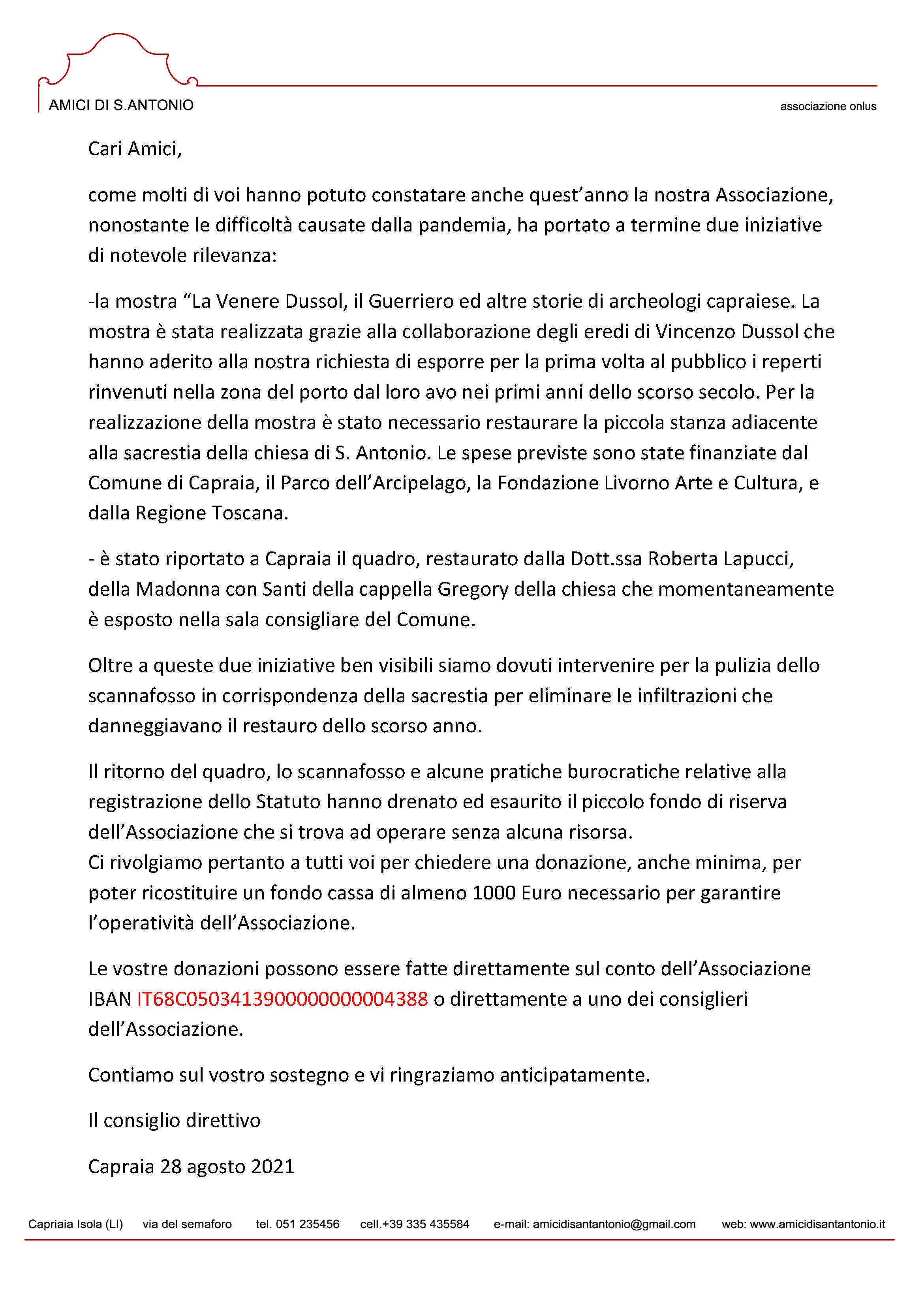 Il 28 agosto 2021 è stata inviata ai soci la seguente lettera con la quale il Consiglio Direttivo invitava i Soci a effettuare dell donazioni per creare un fondo cassa di almeno 1000 Euro.