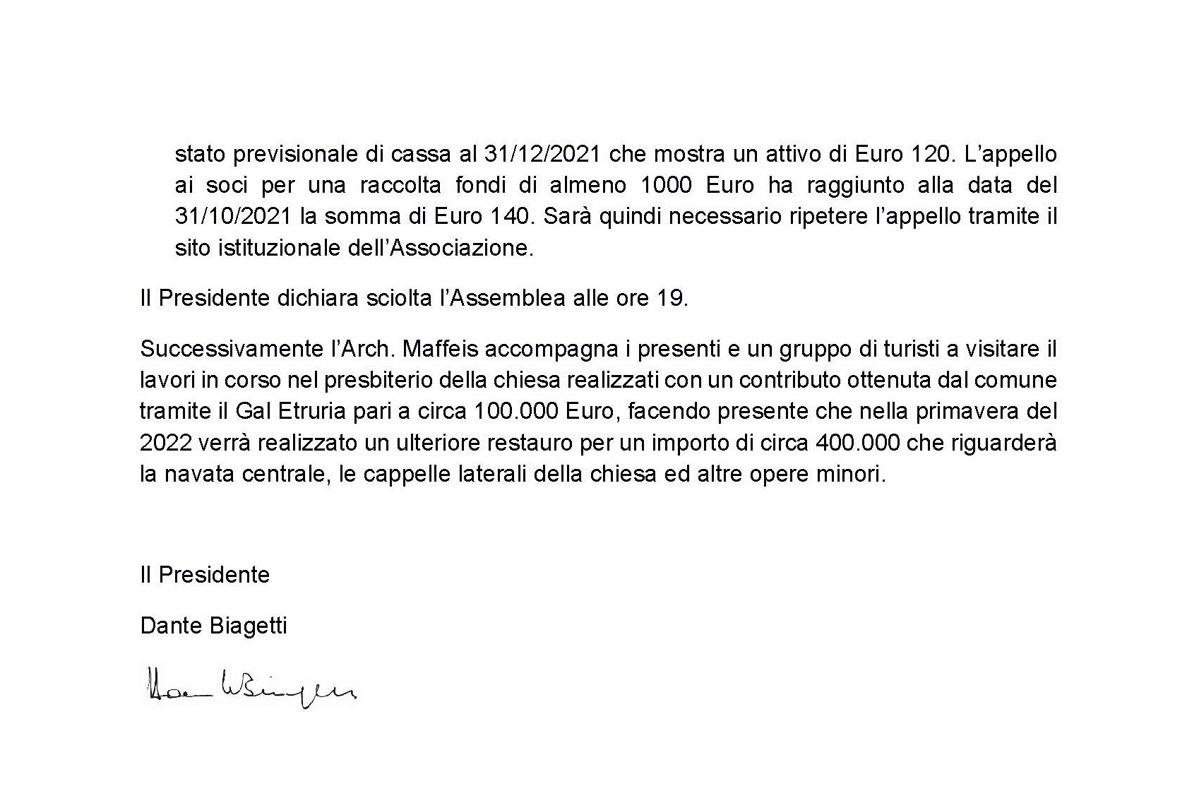 I rinnovati consiglieri presenti confermano nelle cariche sociali Il Sig. Dante Biagetti come Presidente dell’Associazione e l’ing. Roberto Moresco come segretatio e tesoriere.