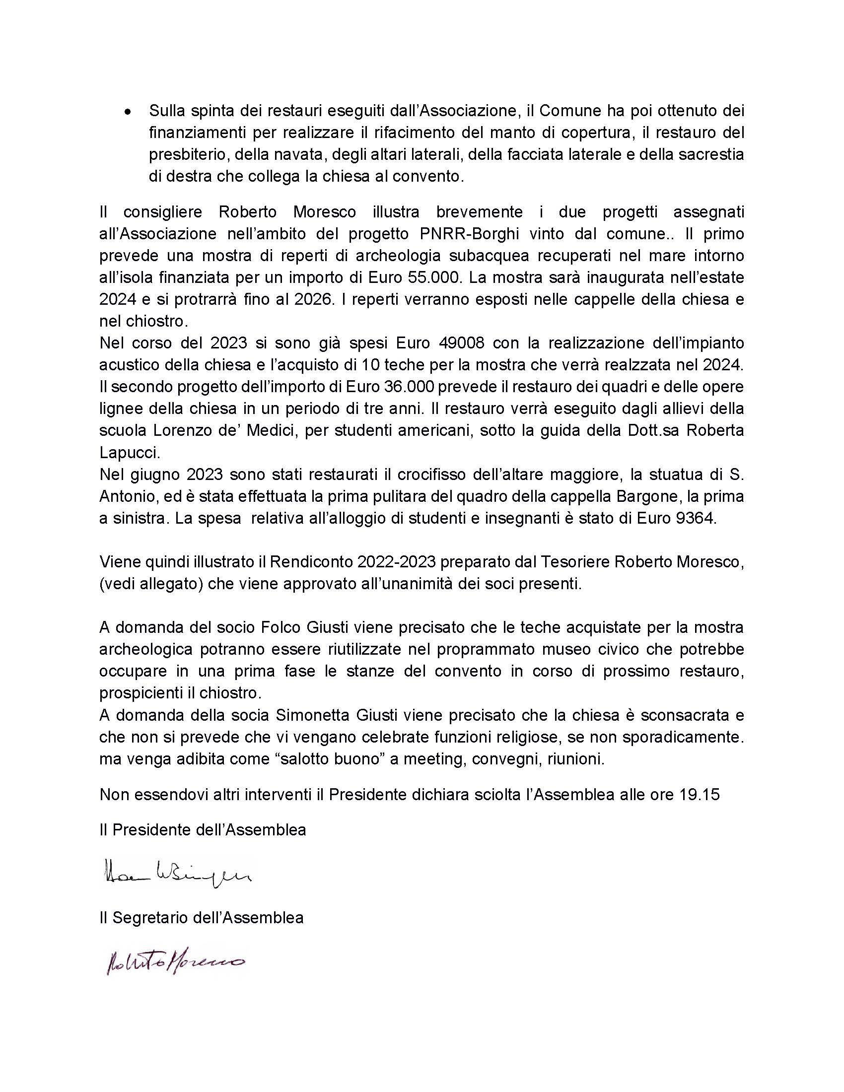 Il giorno 22 agosto 2024 si è tenuta alle ore 18.30, in seconda convocazione, nella chiesa di S.Antonio in Capraia Isola, l’Assemblea Ordinaria dei Soci dell’Associazione “AMICI DELLA CHIESA DI S. ANTONIO IN CAPRAIA APS”, con il seguente ordine del giorno: