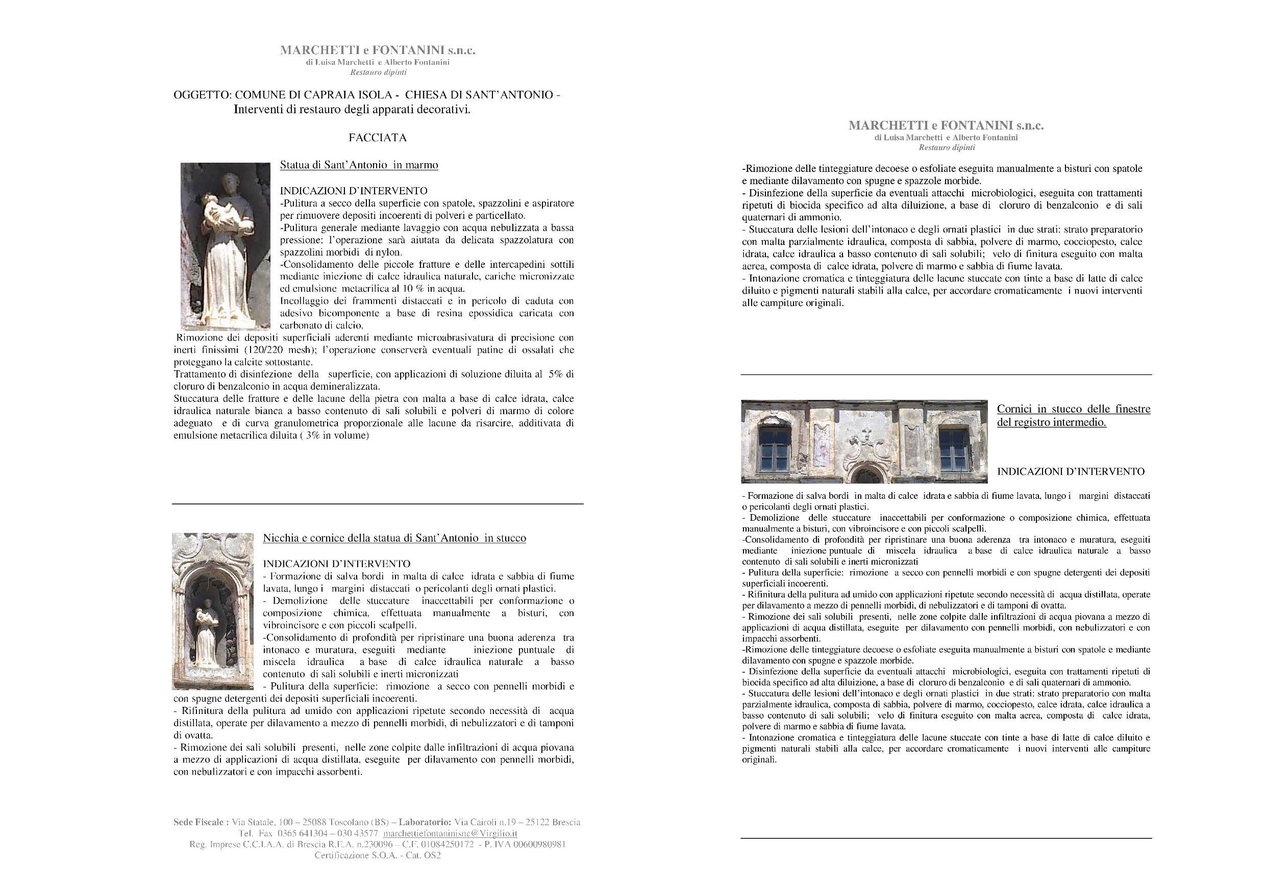 Sarà innanzitutto restaurata la facciata della Chiesa, su iniziativa della Associazione degli amici di S.Antonio, che sulla base di una specifica convenzione con il Comune di Capraia si è impegnata ad eseguire direttamente i lavori con fondi propri.